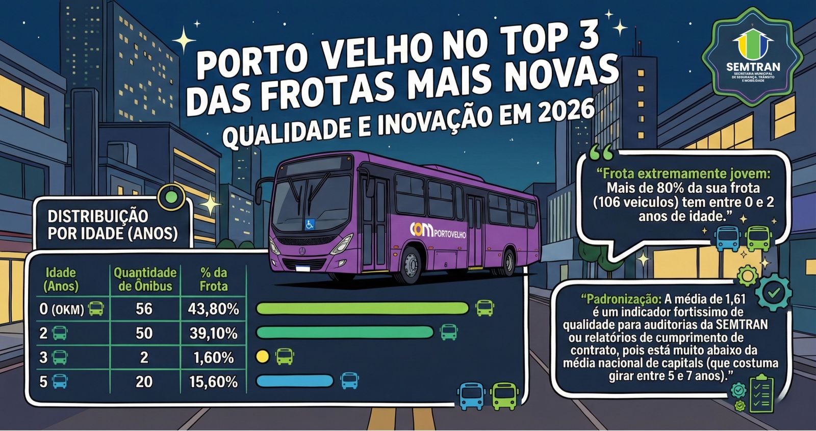 Segundo o mais recente levantamento da frota, a idade média dos veículos em operação atingiu a marca de 1,61 anos — um índice significativamente inferior à média das maiorias das capitais brasileiras, que oscila entre 5 e 7 anos.